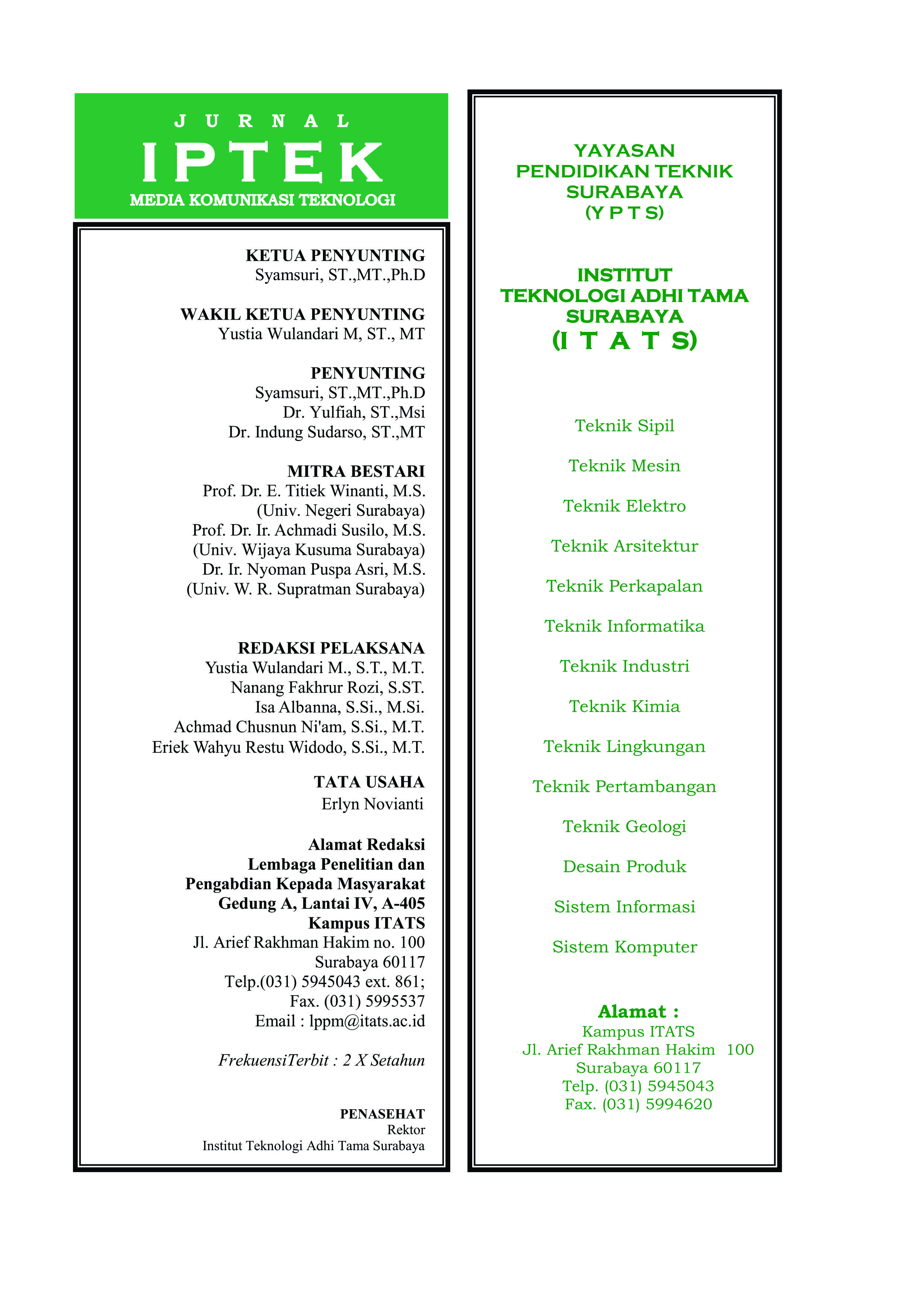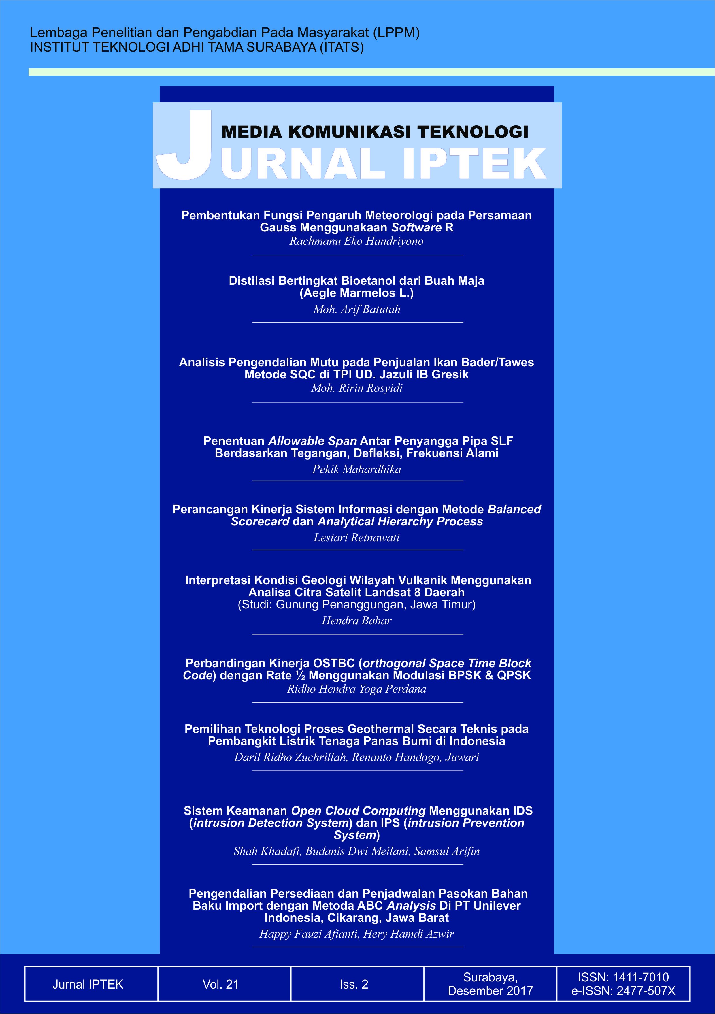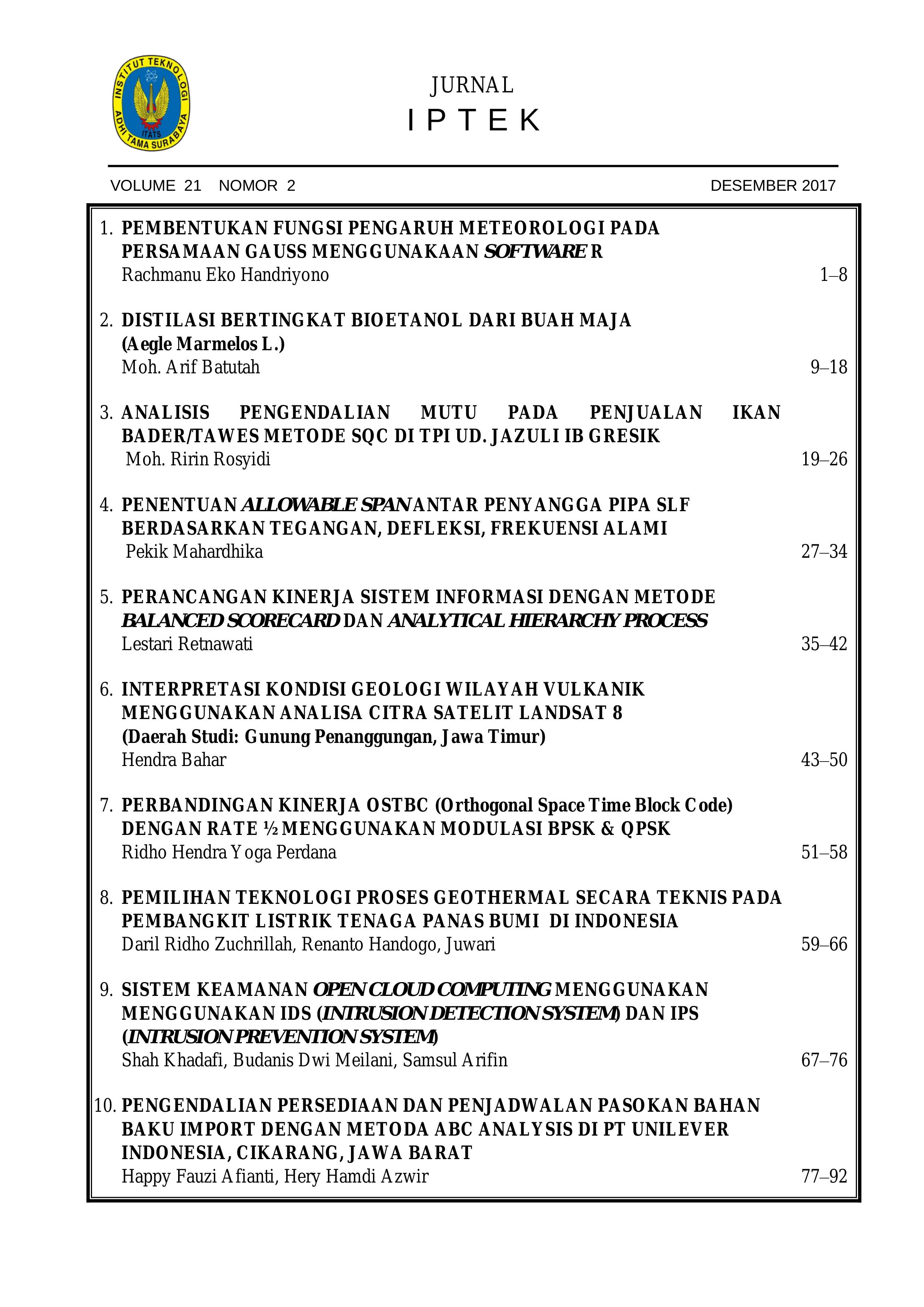 Jurnal IPTEK Vol. 21 No. 2, 2017 contains ten papers.