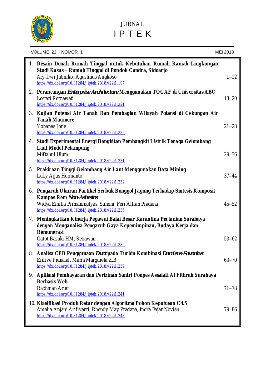 Jurnal IPTEK Vol. 22 No. 1, 2018 contains ten papers with the authors' diversity came from: